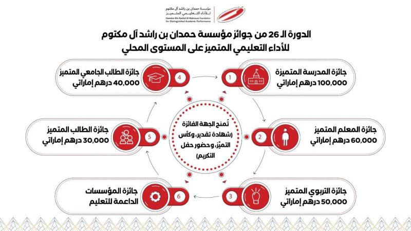 وقال الدكتور خليفة السويدي، الأمين العام لمؤسسة حمدان بن راشد آل مكتوم للأداء التعليمي المتميز: «يسرنا إعلان فتح باب المشاركات لجوائز المؤسسة على المستوى المحلي في دورتها الـ26، والتي ظلّت على مر السنوات تعكس رؤية وأهداف المؤسسة ومسيرتها الرائدة، وقدمت إسهامات واضحة في دعم التعليم وتعزيزه بالبرامج النوعية وتسليط الضوء على الموهوبين ودعمهم وتشجيع التميز، وبث روح المنافسة وتكريم المتميزين ورعايتهم، والمساهمة في بناء منظومة الجودة التعليمية ونشر الوعي التربوي في مجالات التميز بالدولة، بما يتماشى مع النهضة الشاملة والتطور الرقمي المتسارع ورؤية قيادتنا الرشيدة وجهودها الحثيثة في ترسيخ وتشجيع مفاهيم الابتكار والتميز».