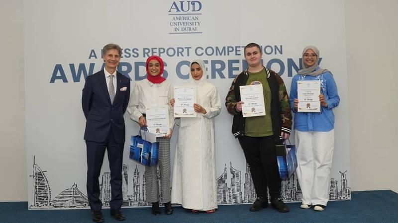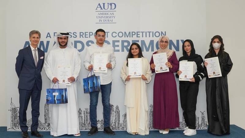 نظمت الجامعة الأمريكية في دبي الإثنين، حفل توزيع جوائز مسابقة «التقرير الصحفي» التي طرحتها لطلبة الثانوية العامة في المدارس الحكومية والخاصة، وباللغتين العربية والإنجليزية، وللطلبة المواطنين والمقيمين، بعنوان «الإمارات أجمل شتاء في العالم».