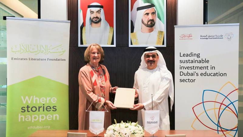 يأتي ذلك بناءً على اتفاقية التعاون التي وقّعها كل من عبد الله محمد العور المدير التنفيذي لمؤسسة صندوق المعرفة، وإيزابيل أبو الهول مؤسس ومستشار وأمين مؤسسة الإمارات للآداب.