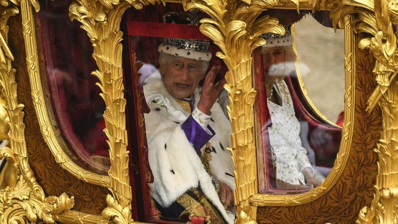غادر الملك تشارلز والملكة كاميلا، كنيسة وستمنستر على متن العربة الملكية الذهبية، بعد انتهاء مراسم تتويجهما، السبت.