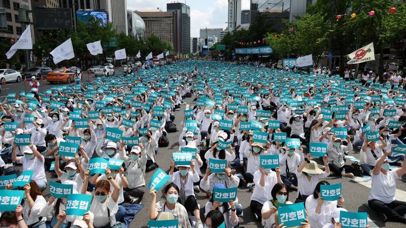 أعلن عشرات الآلاف من العاملين بالتمريض في كوريا الجنوبية، إضراباً الجمعة، بعدما رفض رئيس البلاد يون سوك يول، إقرار قانون لتحسين الأجور وظروف العمل، وسط احتجاجات من الأطباء ومساعدي التمريض، الذين يقولون إن القانون من شأنه أن يسبب ضرراً إلى عملهم.