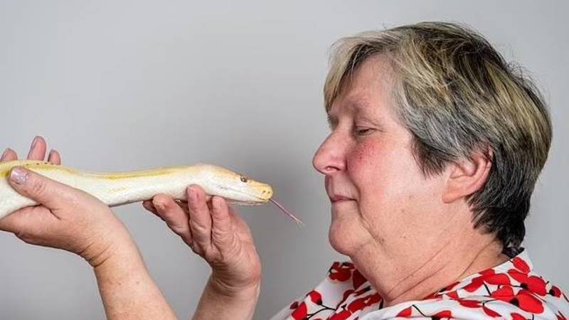 قهرت البريطانية روزي كيم، 63 عاماً، من هاي ويكومب، باكينغهام شاير، رهابها من الثعابين بتبني أفعى بورمية طولها 3 أمتار.