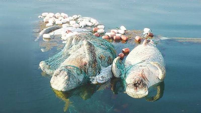 وسواء فُقدت أو تم رميها، تستمر شبكات الصيد المصنوعة من النايلون في اصطياد الحيوانات البحرية لأشهر وحتى لسنوات؛ إذ تقع فيها سلاحف وفقميات وحيتان ودلافين وطيور بحرية.
