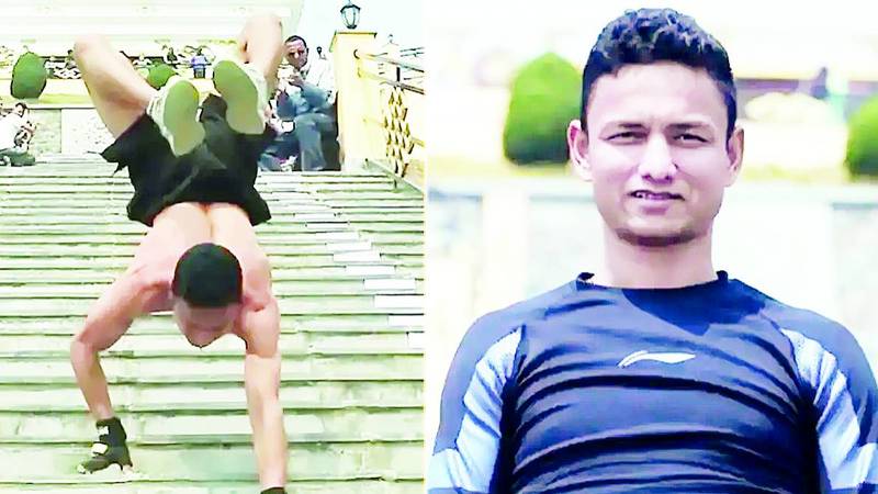 سجل النيبالي هاري شاندرا جيري، 29 عاماً رقمه القياسي العالمي الرابع في موسوعة «غينيس» بالنزول عبر 75 درجة على يديه في 25.03 ثانية ومحطماً الرقم القياسي السابق الذي سجله الأمريكي مارك كيني عام 2014 لأسرع نزول عبر الدرج بالسير على اليدين في وقت قدره 30.8 ثانية.
