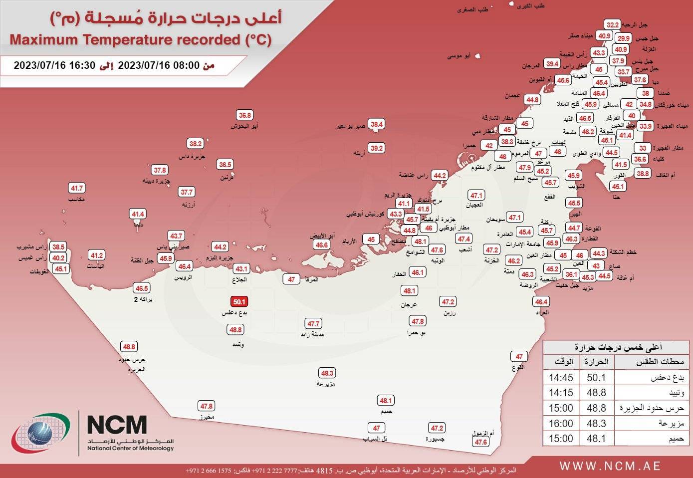 سجلت بدع دعفس بمنطقة الظفرة في أبوظبي، الأحد، ولليوم الثاني على التوالي أعلى درجة حرارة في الدولة، بواقع 50.1 درجة مئوية عند الساعة 14:45 بالتوقيت المحلي لدولة الإمارات، بينما سجلت أقل درجة حرارة في الفرفار بالفجيرة 26.3 درجة مئوية عند الساعة 4:45 صباحاً.