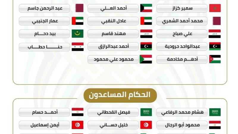 واعتمد هاني بلان رئيس لجنة الحكام في الاتحاد العربي قائمة تضم 26 حكماً للساحة و32 حكماً مساعداً.
