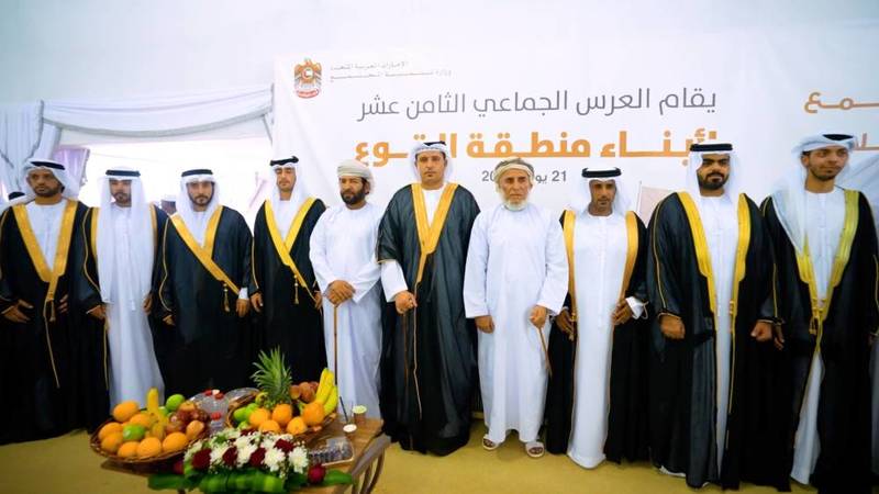 نظمت وزارة تنمية المجتمع، بدعم من مصرف أبوظبي الإسلامي، عرساً جماعياً لعدد من أبناء قبيلة الدروع، في منطقة القوع بمدينة العين، وذلك في إطار التزامها بترسيخ ثقافة الأعراس الجماعية وخفض تكاليف الزواج.