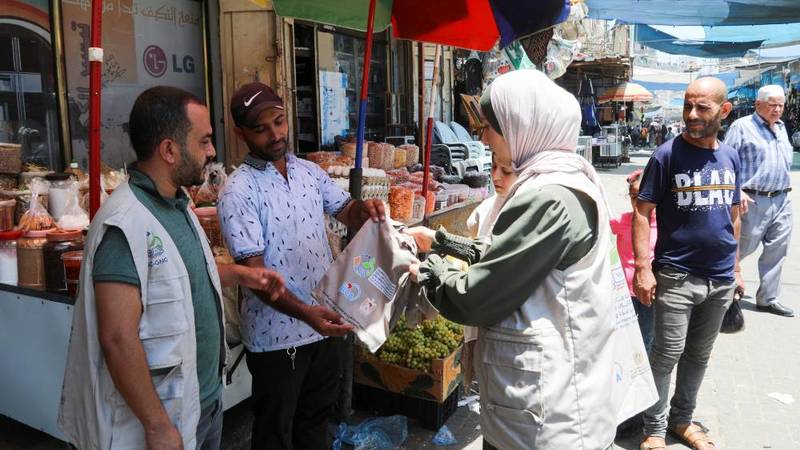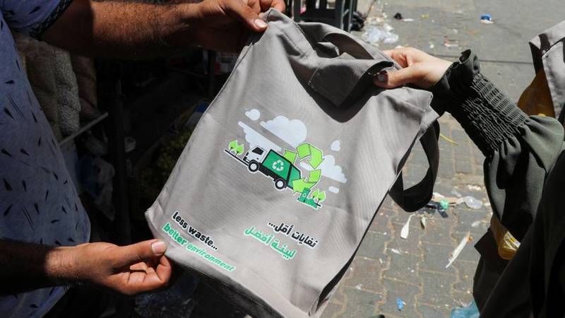 توزع حملة «استبدلها» في غزة، أكياساً مصنوعة من القماش، لتشجيع السكان على عدم استخدام الأكياس البلاستيكية التي قد يكون مصيرها في البحر أو الشوارع.