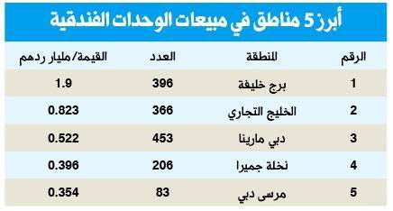 تركزت مبيعات القطاع الفندقي (الغرف والشقق) في 22 منطقة من بين شتى مناطق التطوير الحضاري في دبي، حيث تصدرت منطقة «برج خليفة» المركز الأول من حيث القيمة بواقع 1.9 مليار درهم نتجت عن 396 صفقة، ثم«الخليج التجاري» ثانياً بنحو 823 مليون درهم تحققت من خلال 366 صفقة.