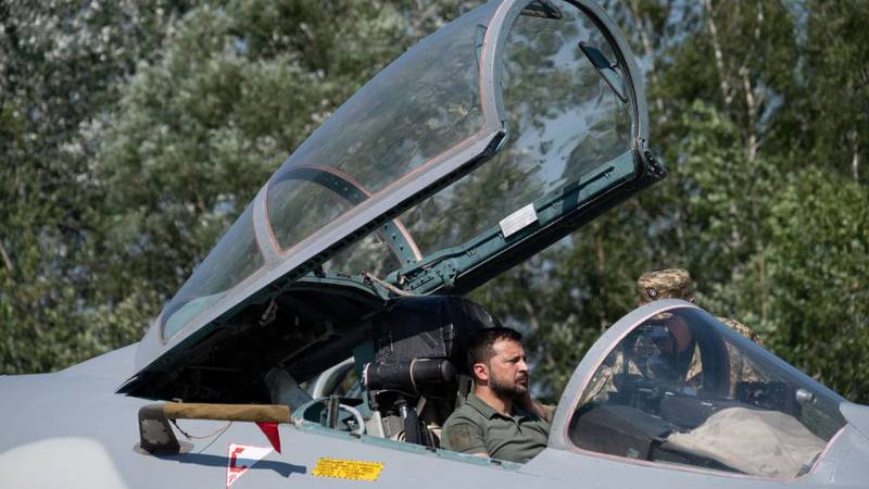 واستمع زيلينسكي إلى تقرير حول عمل وقدرات أنظمة الدفاع الجوي «باتريوت» و«IRIS-T»، كما تفقد طائرة هجومية من طراز «سو-25» وقاذفة قنابل من طراز «سو-24 إم» و«سو-27» و«ميغ-29»، خلال إحياء يوم القوات الجوية الأوكرانية، الأحد.