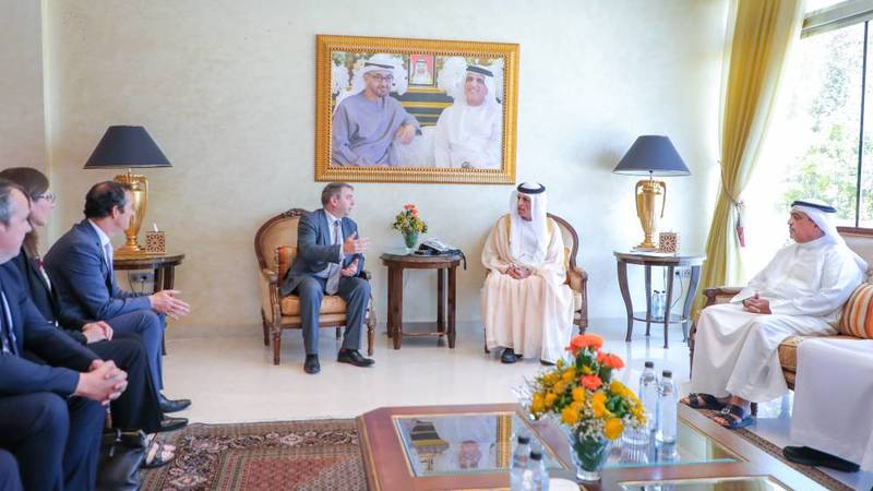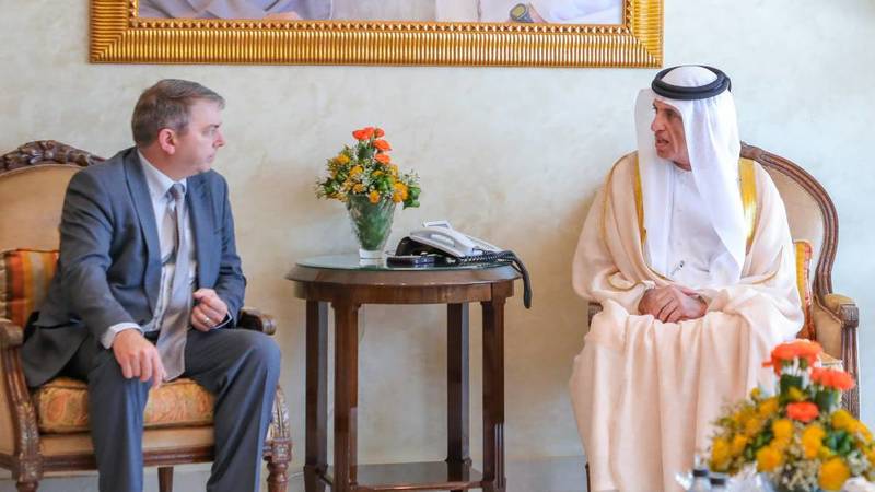 ورحب صاحب السمو حاكم رأس الخيمة، بالمبعوث التجاري والسفير، والوفد المرافق، متمنياً لهم التوفيق والنجاح في أداء مهام عملهم بما يسهم في تعزيز علاقات التعاون المتينة بين البلدين الصديقين على مختلف الصعد.