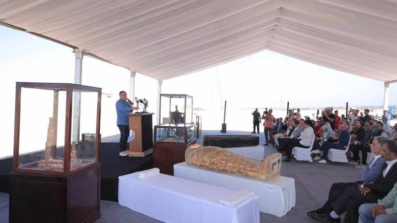 وقال د.مصطفى وزيري، في مؤتمر صحفي من المنطقة: إن أعمال حفائر البعثة الأثرية المصرية التابعة للمجلس الأعلى للآثار بدأت في عام 2017، لافتاً إلى أبرز الاكتشافات الأثرية للبعثة.