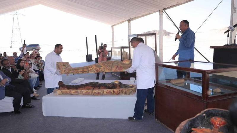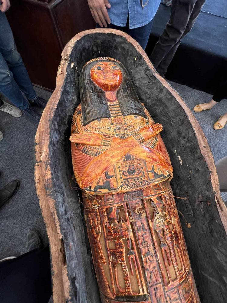 وأوضح أنه تم العثور على إحدى الدفنات التي تحوي تابوتاً خشبياً منقوشاً وملوناً للسيدة «تا دى ايسة» بنت «إيرت حرو» كبير كهنة جحوتى بالأشمونين، حيث عثر بجانبها على صندوقين من الخشب يحويان الأواني الكانوبية الخاصة بها، بالإضافة إلى مجموعة كاملة من تماثيل الأوشابتى وتمثال بتاح سكر ولأول مرة يتم العثور في الموقع على لفافة بها بردية كاملة بحالة جيدة من الحفظ.