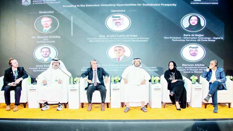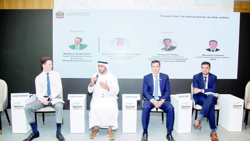 كما تحدث العجلة في جلسة»الاستثمار في الإمارات: فتح الفرص لتحقيق الازدهار المستدام«خلال الفعالية التي نظمتها وزارة الصناعة والتكنولوجيا المتقدمة وملتقى الاستثمار السنوي (AIM) ضمن برنامج المنتدى، مؤكداً أن الشارقة تعمل على تطوير مشاريع مستدامة كجزء من رؤيتها للنمو الاقتصادي والمسؤولية البيئية، موضحاً أن رؤية الاستثمار في الشارقة لا تقتصر على جذب الاستثمارات فحسب، وإنما تراعي معايير الوصول لمستقبل أكثر استدامة.