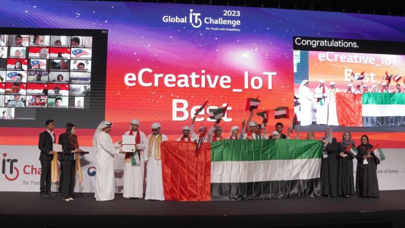 فاز فريق الإمارات بالجائزة الأولى في تحدي استخدام تكنولوجيا المعلومات لتسهيل حياة أصحاب الهمم «creativeIoT E» في ختام الجولة النهائية من تحدي تكنولوجيا المعلومات العالمي للشباب من أصحاب الهمم 2023.