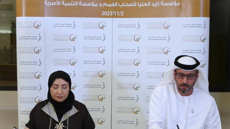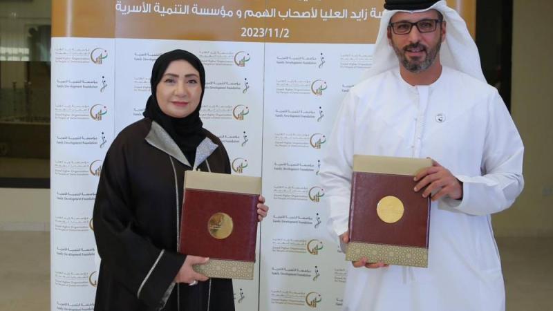 وقعت مؤسسة التنمية الأسرية، مذكرة تفاهم مع مؤسسة زايد العليا لأصحاب الهمم، وذلك بهدف التعاون وتوفير المعالجين والكادر التأهيلي وتقديم الاستشارات المناسبة، إضافة إلى خدمات التقييم والإرشاد والتدريب والتوجيه والتحويل، وتوفير المكان المناسب، وتقديم الخدمات العلاجية لأصحاب الهمم في المنطقة بجودة عالية.