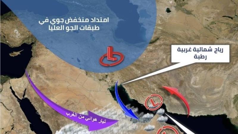 تتأثر الإمارات اعتباراً من يوم غد بامتداد منخفض جوي سطحي من الشرق مع امتداد منخفض في طبقات الجو العليا يصاحبه تيار هوائي من الغرب وكتلة هوائية رطبة وباردة مع تدفق السحب من الغرب على فترات يتخللها بعض السحب الركامية على مناطق متفرقة خاصة شرقاً وشمالاً يصاحبها سقوط أمطار خفيفة إلى متوسطة قد تكون غزيرة على مناطق محدودة.