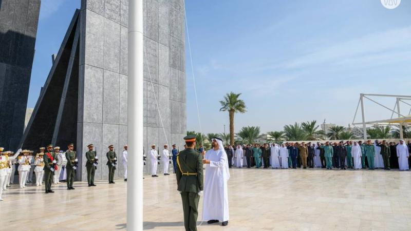 رفع سموّ الشيخ ذياب بن محمد بن زايد آل نهيان، رئيس مكتب الشؤون التنموية وأسر الشهداء في ديوان الرئاسة، علم دولة الإمارات العربية المتحدة في واحة الكرامة بأبوظبي، احتفالاً بمناسبة «يوم العلم».