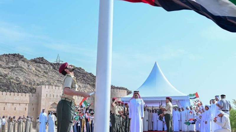 قام سمو الشيخ عمار بن حميد النعيمي ولي عهد عجمان، صباح الجمعة، برفع علم الدولة على سارية أعدت خصيصاً بجانب متحف مصفوت في عجمان، حيث تم عزف تحية العلم أثناء رفعه والسلام الوطني.