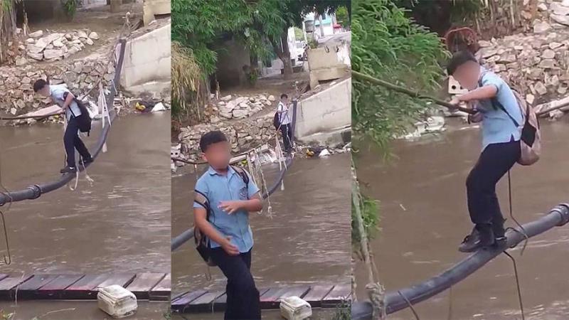 يخاطر 70 تلميذاً من منطقة فيلا ليدي، بالقرب من مدينة سانتا مارتا الساحلية في كولومبيا، بحياتهم يومياً للوصول إلى المدرسة بعبور جسر مؤقت على نهر غايرا المملوء بالتماسيح.