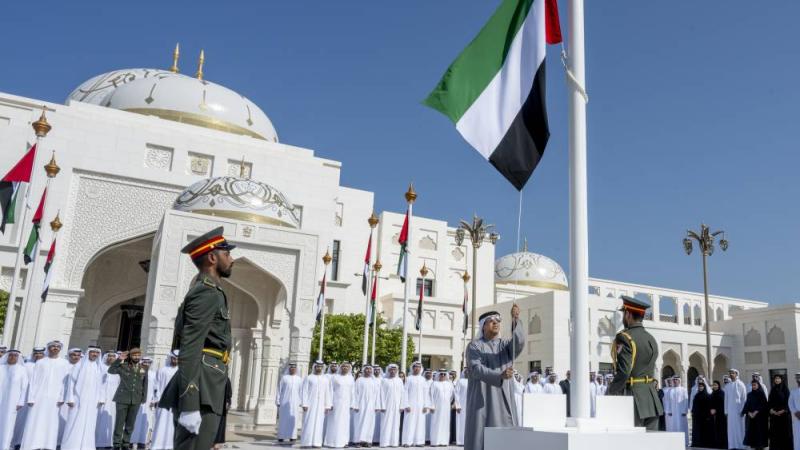 منصور بن زايد يرفع علم الإمارات على سارية قصر الوطن