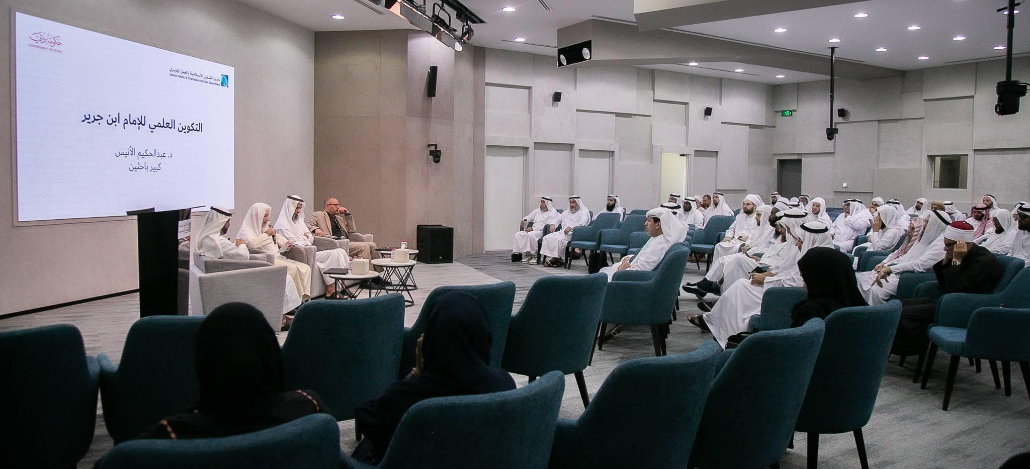 حضر الندوة أحمد درويش المهيري مدير عام الدائرة، ولفيف من موظفي الدائرة وطلبة العلم من المدارس والجامعات، وبدأت الندوة بتلاوة عطرة للقرآن الكريم، وعرض فيديو عن ترجمة الشيخ الإمام ابن جرير الطبري، ثم ألقى كلمة الدائرة إبراهيم جاسم المنصوري رئيس قسم الإرشاد الديني، بين فيها أن «الأسبوع الثقافي السنوي» يتناول أحد أعلام الدين في مختلف الاختصاصات، ويتم تعريف الحضور بأهم المعلومات التي تتعلق بهذه الشخصية، واليوم نتناول شخصية الإمام ابن جرير الطبري من خلال التطرق لسيرته العلمية ومؤلفاته وجهوده في خدمة الإسلام والمسلمين، بهدف بيان فضل العلم وأهله من أئمة الإسلام الذين شيدوا صرح الحضارة الإسلامية بإسهاماتهم العلمية الرائدة.