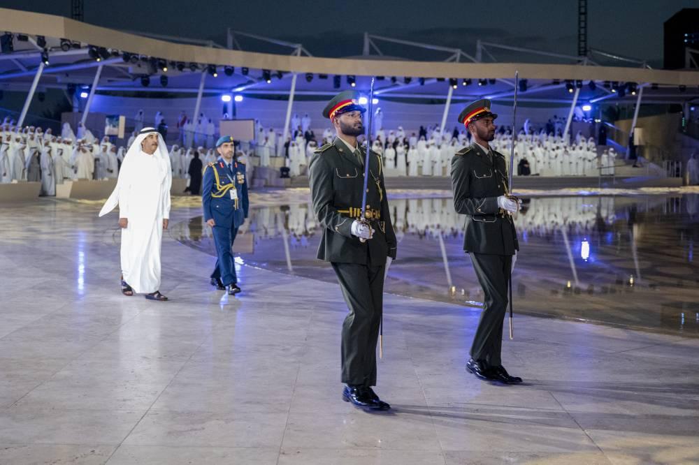 بعد ذلك توجه سموه إلى المنصة الرئيسية، حيث عُزف السلام الوطني لدولة الإمارات العربية المتحدة. وألقى خلدون خليفة المبارك، رئيس جهاز الشؤون التنفيذية عضو المجلس التنفيذي، كلمة يوم الشهيد قال فيها: «إن في تاريخ الأمم والشعوب أياماً ليست كغيرها من الأيام، بما ترمز إليه من معانٍ كبيرة، وما تحمله من دلالات ودورس تظل باقية في نفوسنا.. نعيش معاً اليوم أحد هذه الأيام الغالية على قلوبنا، وهو «يوم الشهيد».. يوم الثلاثين من نوفمبر، حيث نكرم بذكرى شهدائنا الذين ضحوا بأرواحهم فداءً لوطننا الغالي، دولة الإمارات العربية المتحدة».