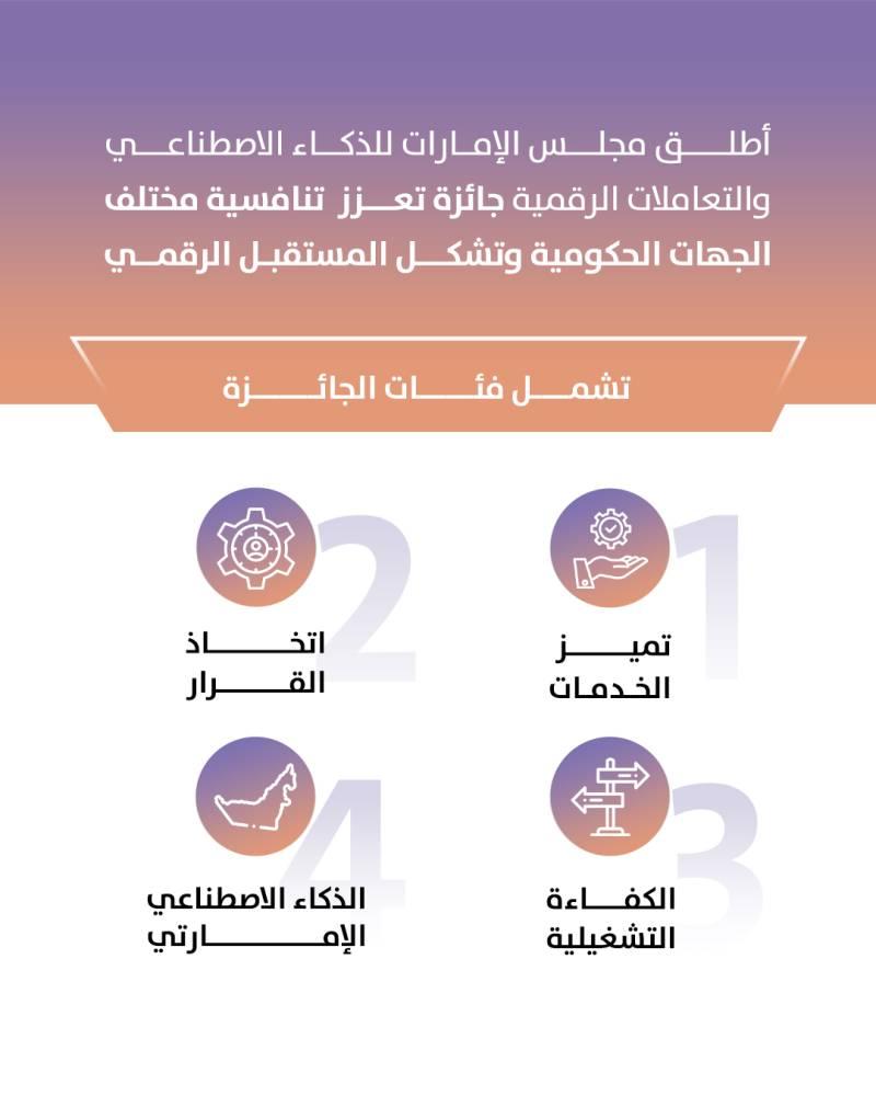 وأطلق مجلس الإمارات للذكاء الاصطناعي والتعاملات الرقمية الجائزة الهادفة إلى تشجيع الجهات الحكومية، الاتحادية والمحلية، على تبنّي حلول الذكاء الاصطناعي المبتكرة لاستشراف مستقبل أفضل مبني على الحلول الرقمية، والتعاون بين الجهات في دولة الإمارات وتعزيز التنافسية الخلاقة التي تهدف إلى ضمان تقدم دولة الإمارات في المجالات الرقمية.