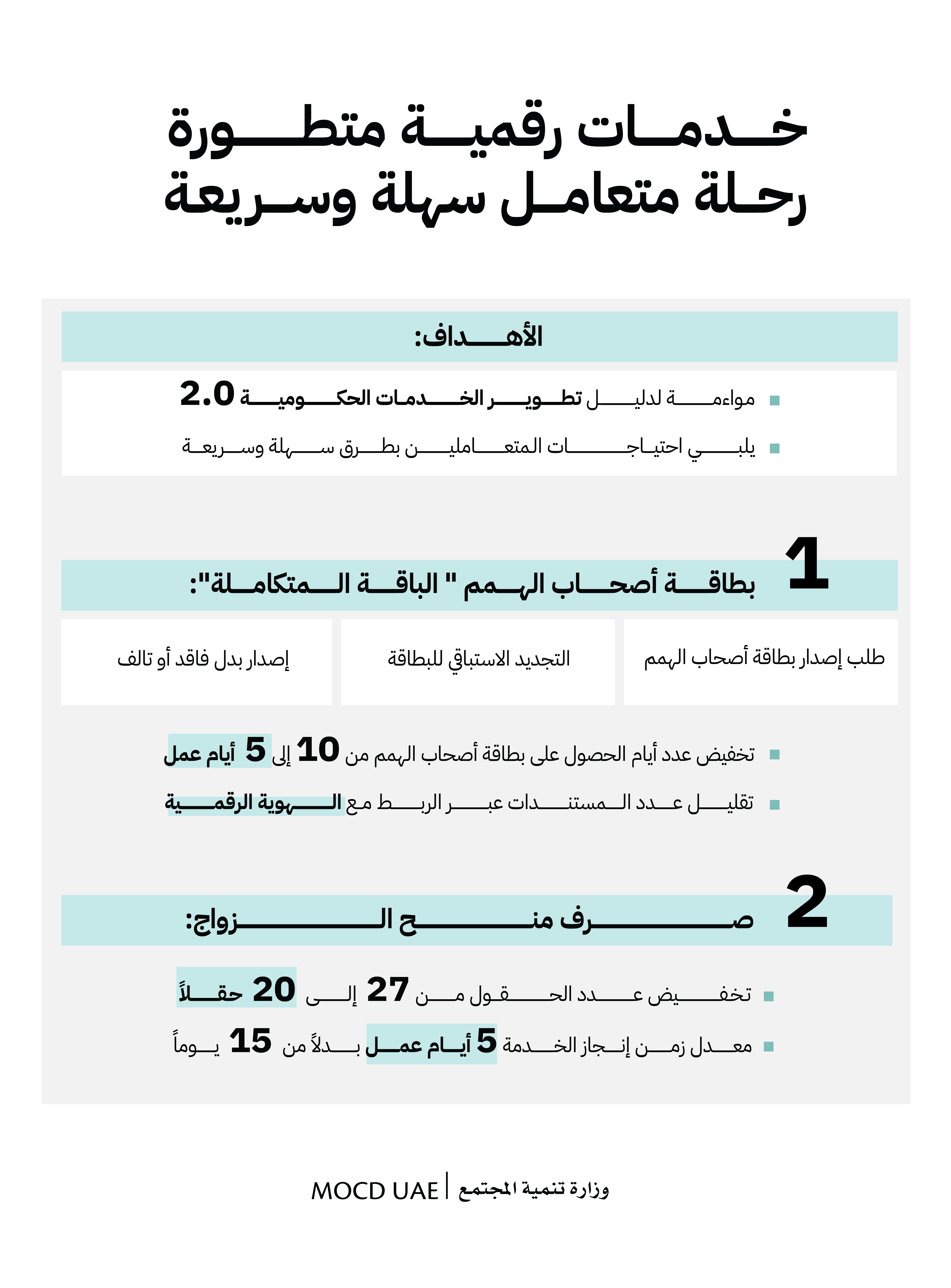 انتهت وزارة تنمية المجتمع من تصميم وتطوير 4 خدمات لتتماشى وتتواءم مع «دليل تطوير الخدمات الحكومية 2.0»، وهي خدمات أصحاب الهمم وتتضمن «طلب إصدار بطاقة أصحاب الهمم، والتجديد الاستباقي، وإصدار بدل فاقد، أو تالف لها»، إضافة إلى خدمة «صرف منح الزواج»، ويأتي ذلك تعزيزاً لرؤية الوزارة في تطوير العمل الحكومي التي تنسجم مع التوجهات الاستراتيجية لحكومة دولة الإمارات في تقديم خدمات رقمية متطورة، وإيصالها إلى المتعاملين من كل الفئات المجتمعية بكل سهولة ويسر،