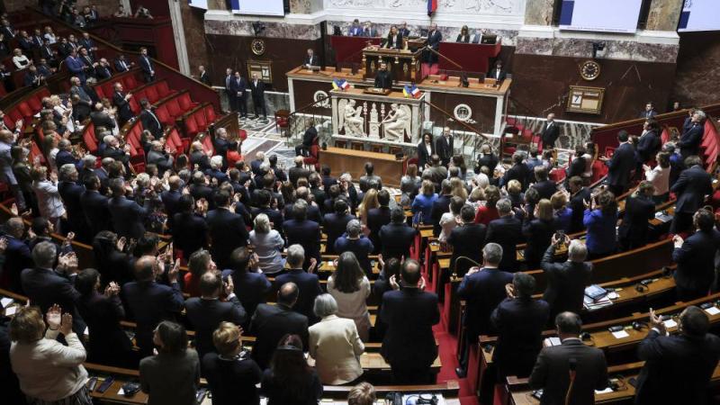 النواب الفرنسيون في الجمعية الوطنية في باريس يصفقون وقوفا تحية للرئيس الاوكراني(أ.ب)