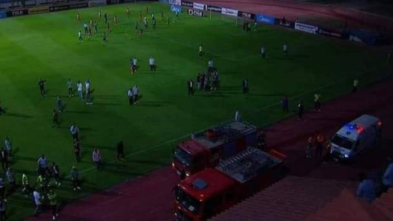 ووصلت على الفور سيارات الإطفاء إلى أرضية الملعب، لمحاولة السيطرة على الحريق، إضافة إلى وجود عربات الإسعاف تحسباً لوجود مصابين.