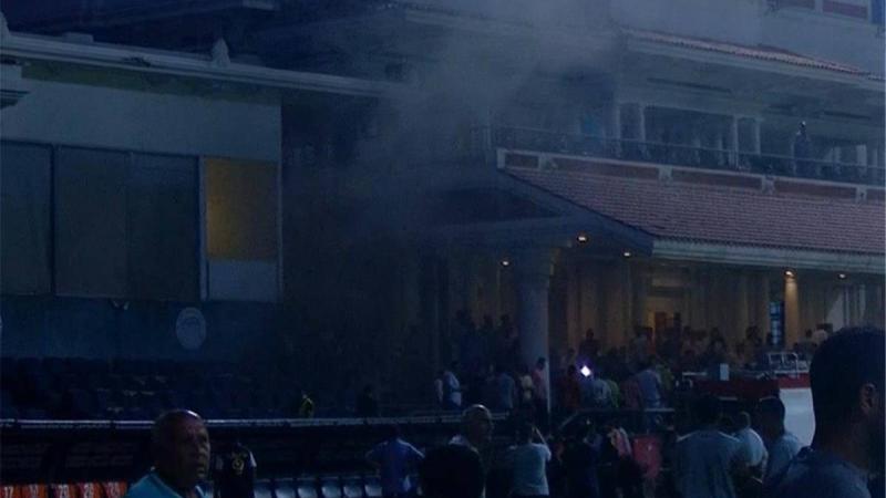 وتصاعد الدخان في مقصورة مباراة بيراميدز وسموحة، بعد اشتعال حريق داخل غرفة التحكم في الكابلات.