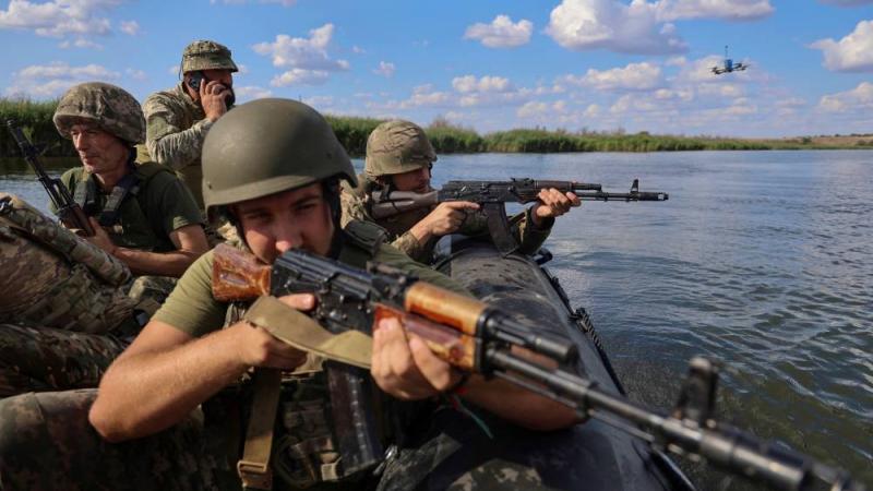 جنود أوكرانيون خلال تدريب على نهر في مقاطعة خيرسون (رويترز)