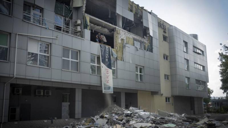 عامل يزيل الأنقاض في مركز طبي خاص في كييف تضرر من ضربات روسية مؤخراً (أ.ب)