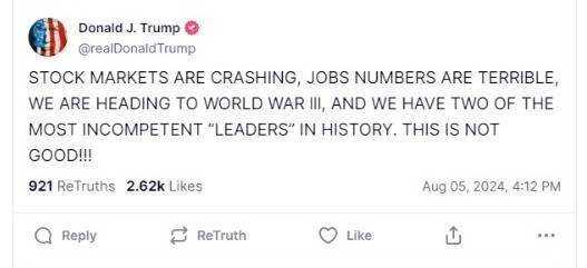 في وقت سابق، اتهم المرشح الرئاسي الأمريكي دونالد ترامب الرئيس جو بايدن ونائبته كامالا هاريس بالمسؤولية عن هبوط سوق الأسهم الأمريكية، وما تشهده البورصات من انخفاض في العالم. جاء ذلك في منشور لترامب على منصة «تروث سوشيال»، حيث كتب: «قلت لكم من قبل! كامالا لا تفهم شيئاً، وبايدن يغط في نوم عميق، والقيادة الأمريكية غير الكفؤة هي المسؤولة عن كل شيء».