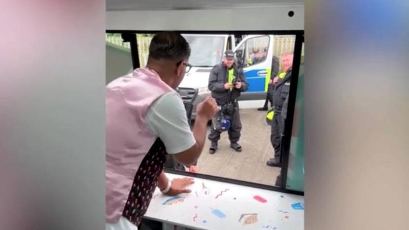 ظهر رجل بريطاني مسلم من المشهورين على مواقع التواصل الاجتماعي امتنانه لأفراد الشرطة الذين يحاولون السيطرة على أعمال شغب عنصرية ومعادية للمهاجرين من خلال توزيع بوظة (آيس كريم) مجاناً من عربة يجوب بها البلاد.