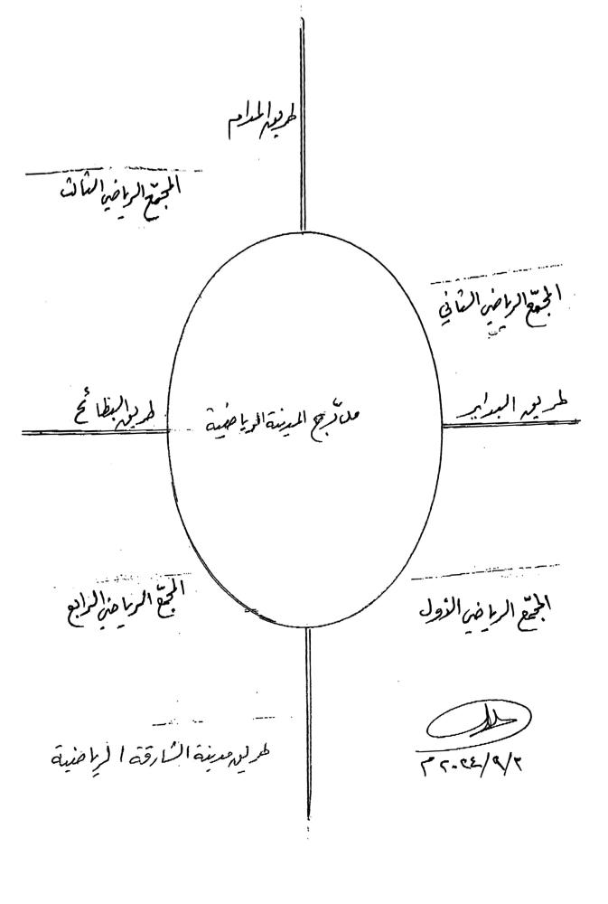 وأوضح أن صاحب السمو حاكم الشارقة، هو من خطط هذا التصميم بخط يده، حيث صمم سموه ميداناً رئيسياً للمدينة الرياضية؛ تتعامد عليه 4 محاور رئيسية للطرق المؤدية إلى هذه المدينة، وهي: (الطريق القادم من المدام، والطريق المؤدي إلى البداير، والطريق المؤدي إلى محافز ومنطقة البطائح، والطريق القادم من مدينة الشارقة الرياضية)، وسيضم هذا الميدان الرئيسي في وسطه «مدرج المدينة الرياضية».