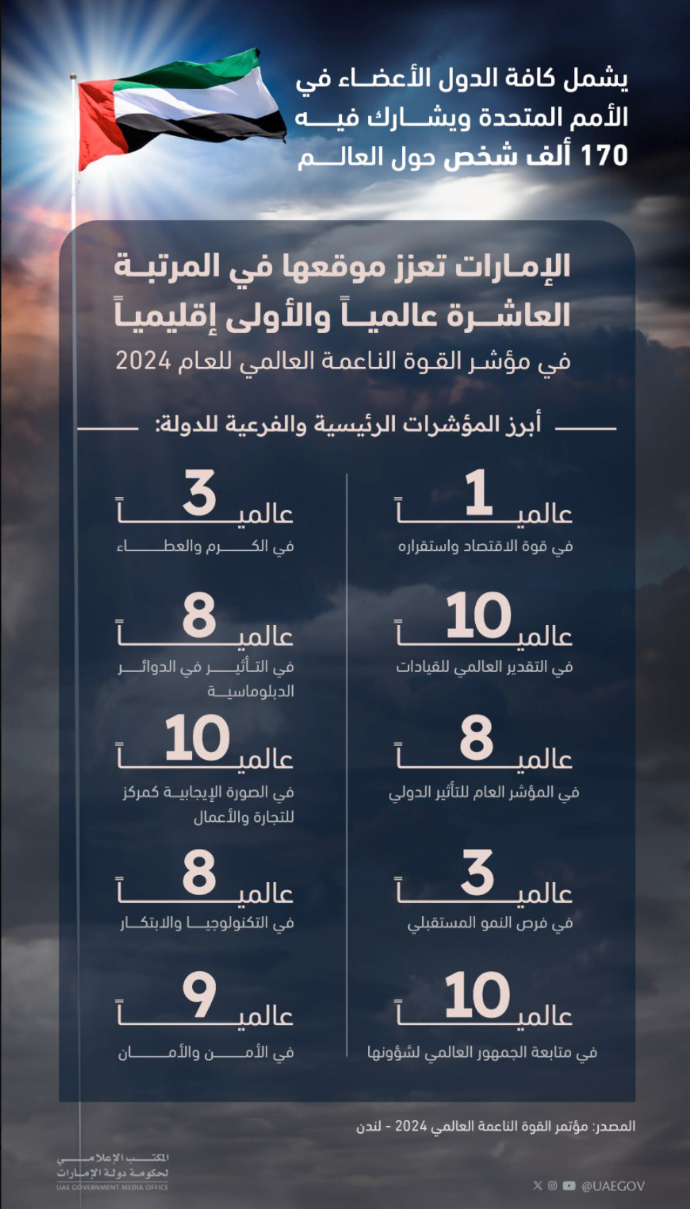 جاء حصاد 2024 التنافسي للدولة، في أفضل نتيجة، وحلت الإمارات في المركز الأول عالمياً في 223 مؤشراً دولياً تنموياً، وضمن المراكز الخمسة الأولى في 444 مؤشراً، في أهم التقارير الدولية المتعلقة ببيئة الأعمال والاقتصاد والبنية التحتية والبنية الرقمية، وحركة المواهب والاستثمار الأجنبي، والأنظمة المالية، ومؤشرات الصادرات والمؤشرات التجارية والسياحية والتكنولوجية وغيرها.