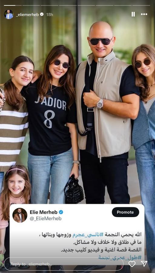وفي السياق نفسه، سار الصحفي اللبناني المقرب من نانسي، إيلي مرعب الذي نشر على حسابه في انستغرام، صورة الثنائي نانسي وفادى وبناتهم وكتب عليها: 'الله يحمي النجمة نانسي عجرم وزوجها وبناتها، ما في طلاق ولا خلاف ولا مشاكل.. القصة قصة اغنية وفيديو كليب جديد.'