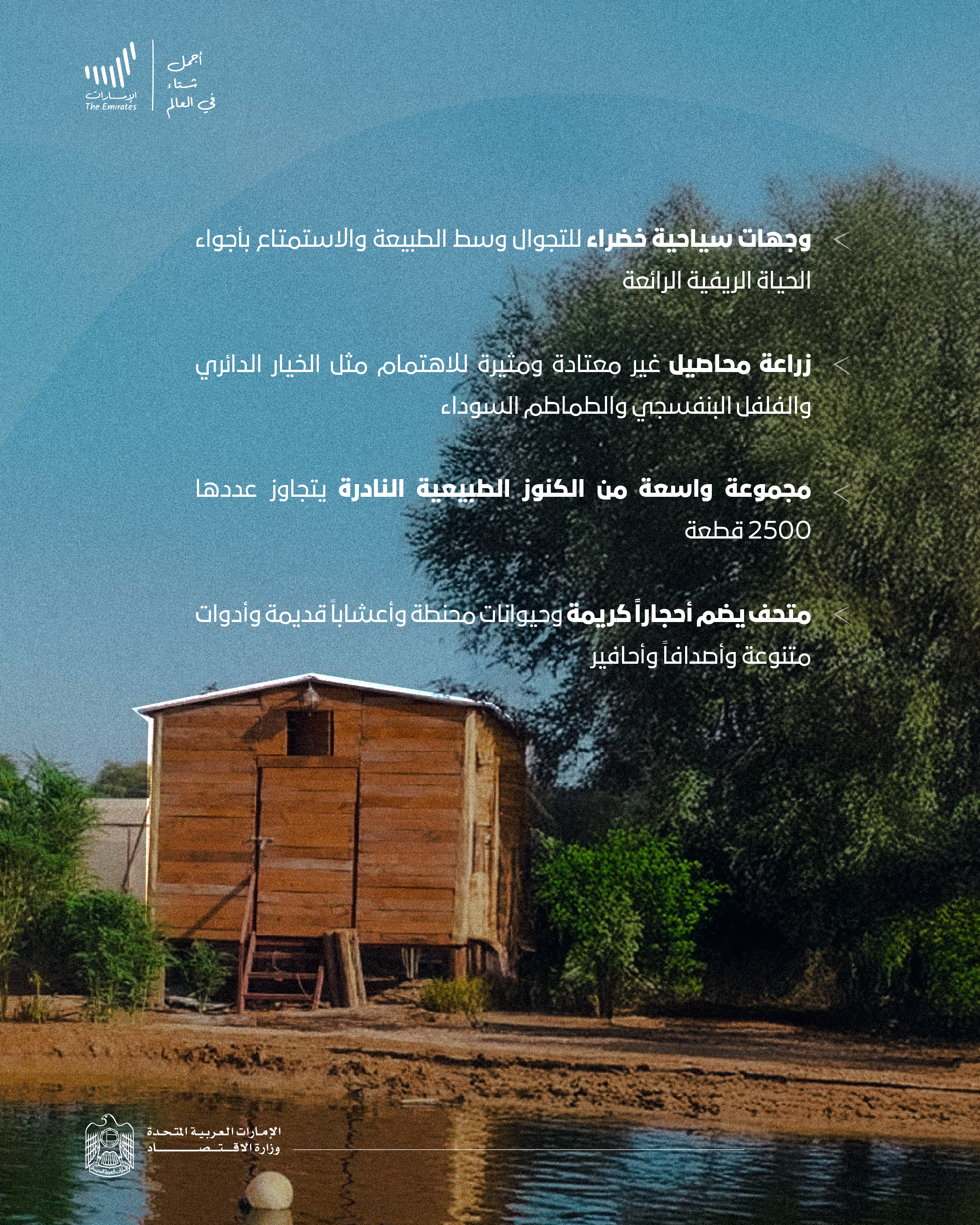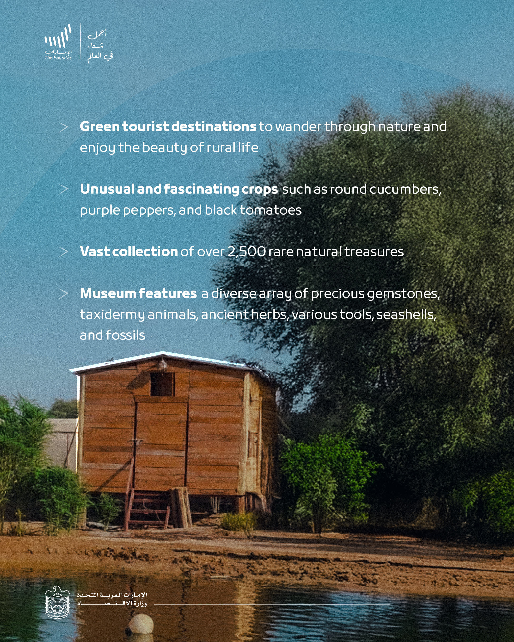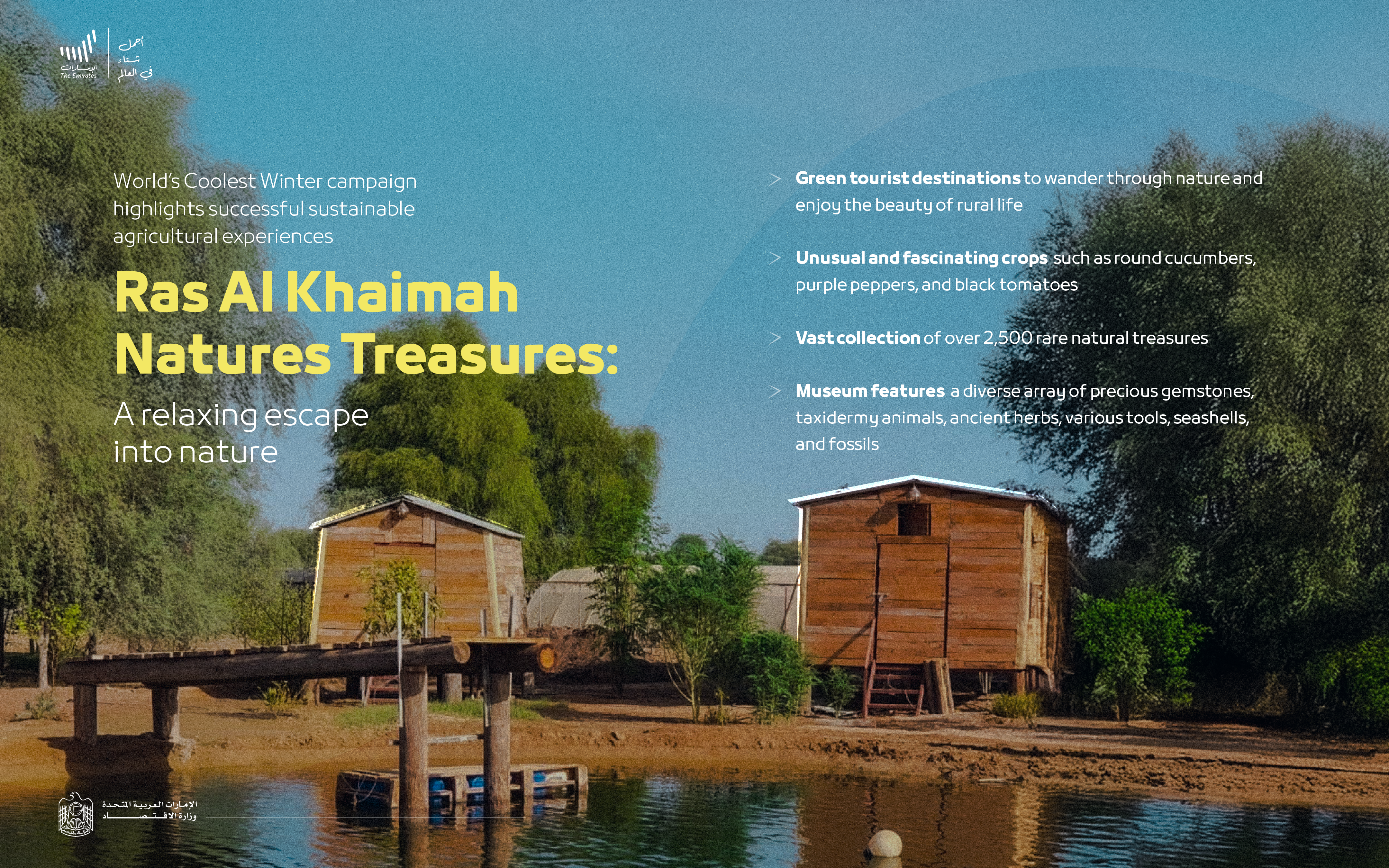 تقدم مزرعة ومتحف كنوز رأس الخيمة الطبيعية سحرها الفريد، الذي يمزج بين جمال الطبيعة الخضراء وكنوزها الطبيعية الثمينة، لتحجز مكانها ضمن الوجهات السياحية الخضراء للتجوال وسط الطبيعة والاستمتاع بأجواء الحياة الريفية الرائعة، وما تحتفظ به من هدوء وجمال، حيث لن تسمع سوى أصوات الحيوانات المحلية والطيور الزائرة، كما يمكن الإقامة في أكواخ خشبية بسيطة تعود بالزائر إلى الطبيعة الخالصة مع الاستمتاع بأمسيات هادئة.