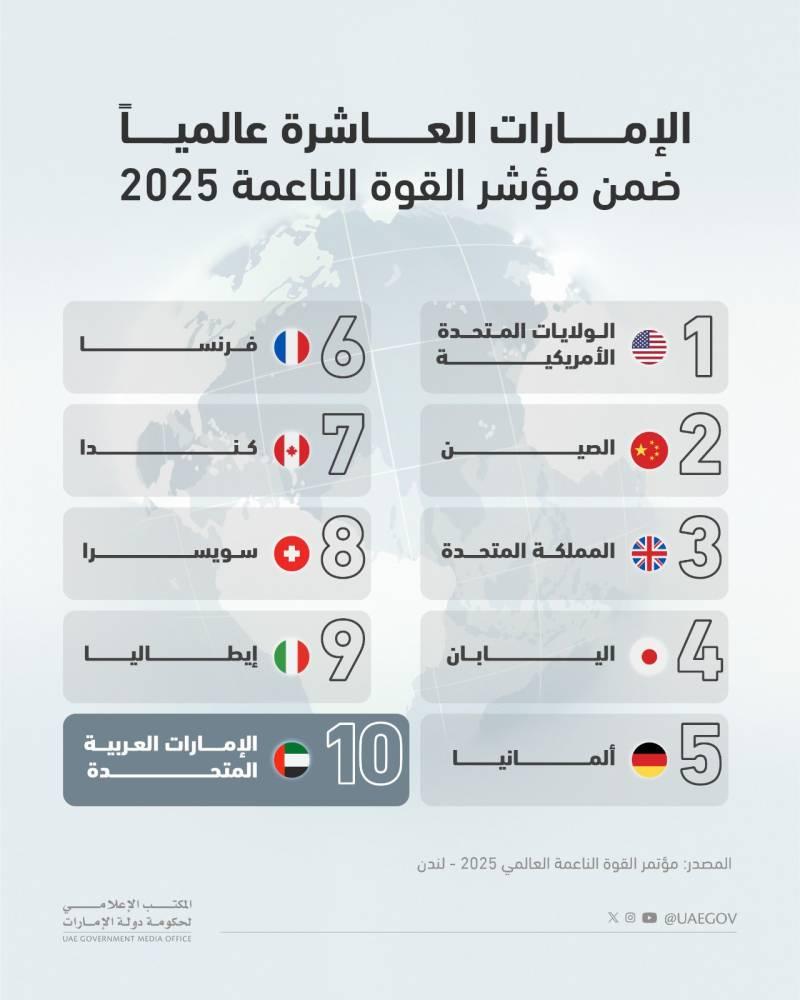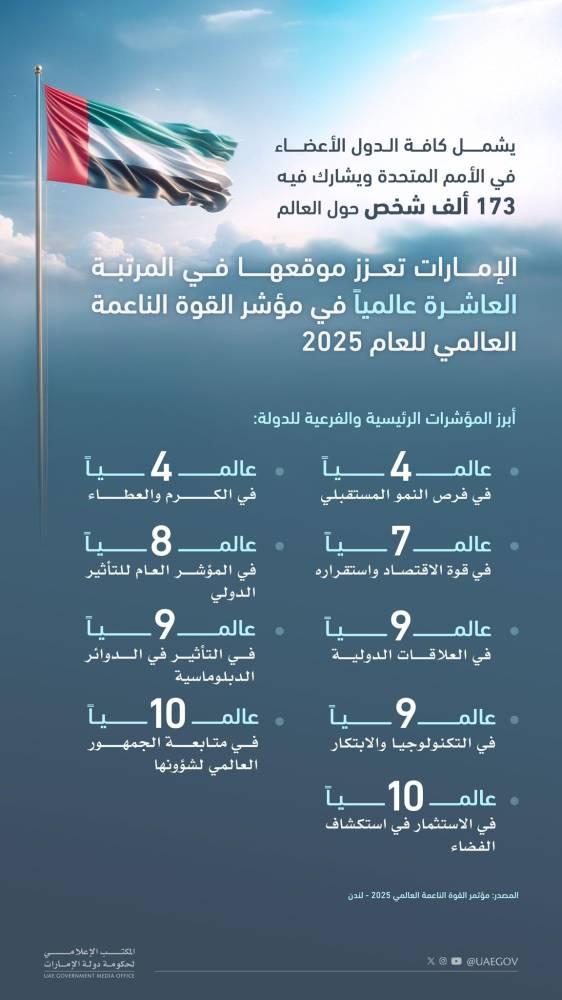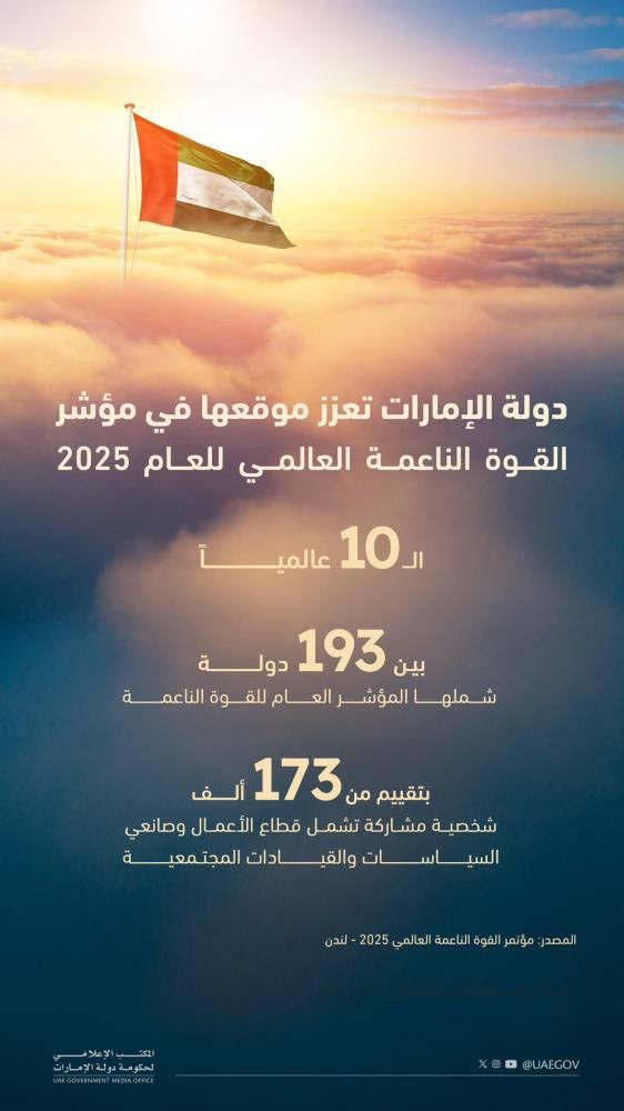 رسّخت دولة الإمارات العربية المتحدة، مكانتها وحافظت على تصنيفها بين الدول العشر الأولى عالمياً في القوة الناعمة، وذلك بفضل نفوذها الدبلوماسي، ومناخ الاستثمار، والتنويع الاقتصادي.