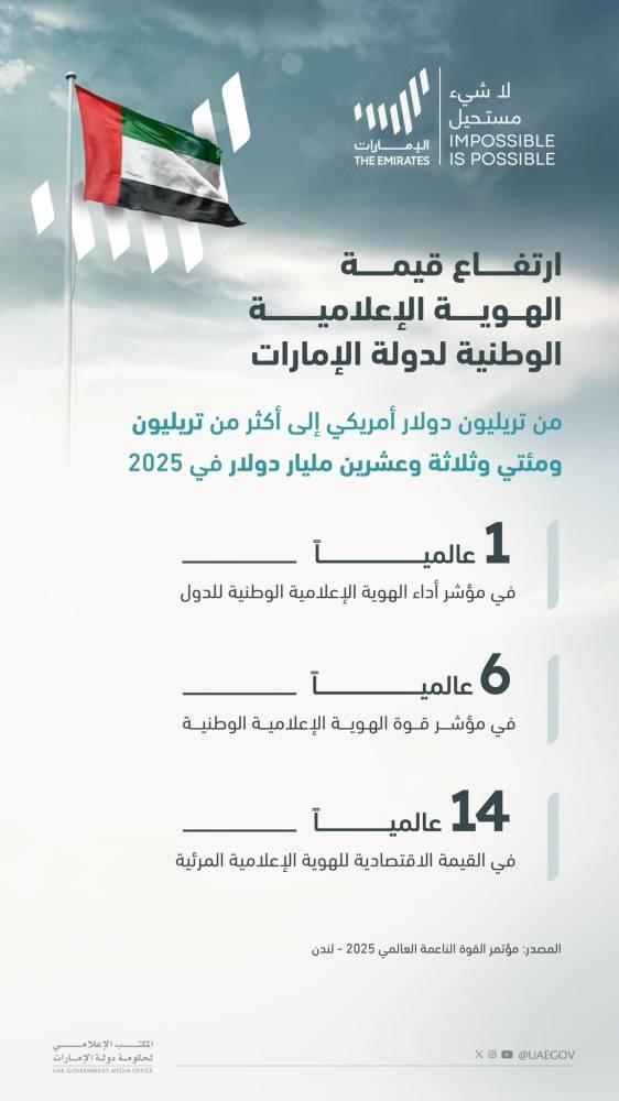 وأضاف سموه: «ووفقاً للتقرير ارتفعت قيمة الهوية الإعلامية لدولة الإمارات من تريليون دولار إلى تريليون ومائتين وثلاثة وعشرين مليار دولار في عام 2025 ... في مؤشر مهم على السمعة العالمية.. والتأثير الإيجابي في أغلب القطاعات الاقتصادية والثقافية العالمية».