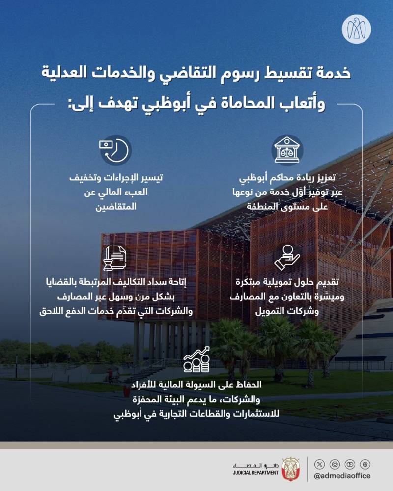 خدمة تقسيط رسوم التقاضي والخدمات العدلية وأتعاب المحاماة، التي أطلقتها دائرة القضاء – أبوظبي، تسهم في تيسير الإجراءات وتخفيف العبء المالي عن المتقاضين، حيث تُتيح سداد التكاليف المرتبطة بالقضايا بشكل مرن وسهل عبر المصارف والشركات التي تقدِّم خدمات الدفع اللاحق.
