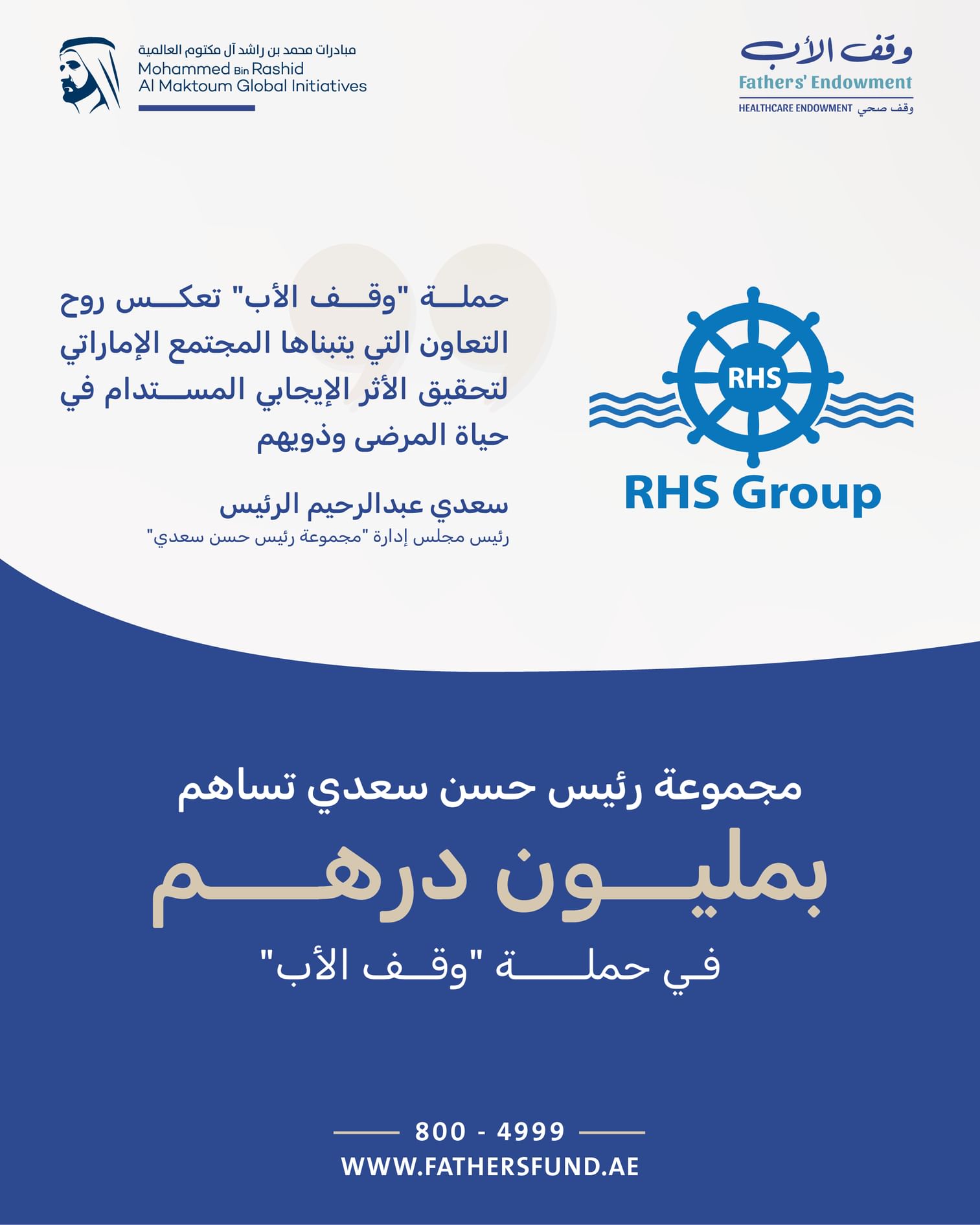 وتندرج مساهمة مجموعة رئيس حسن سعدي ضمن التفاعل المجتمعي الكبير، أفراداً ومؤسسات، مع حملة «وقف الأب» التي تنضوي تحت مظلة مؤسسة «مبادرات محمد بن راشد آل مكتوم العالمية»، وتسعى إلى تكريم الآباء من خلال إتاحة الفرصة لكل شخص للتبرع باسم والده في الحملة، وترسيخ قيم بر الوالدين والمودة والتراحم والتكافل بين أفراد المجتمع، وتعزيز موقع الإمارات في مجال العمل الخيري والإنساني، وتطوير مفهوم الوقف الخيري من خلال إنجاز وقف مستدام يضمن توفير الرعاية الصحية للفئات الأقل حظاً.