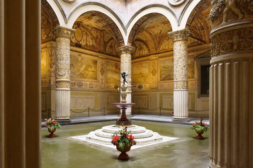 يتردد صدى التاريخ والفن والقوة في الغرف الفخمة والمعارض الفخمة لهذا القصر الشبيه بالحصن في قلب فلورنسا. ومن هنا، حُكمت المدينة، أو الجمهورية، وكلّفت عائلة ميديشي القوية أبرز الفنانين والمهندسين المعماريين في ذلك العصر بتصميم وتزيين مكاتبهم وشققهم.