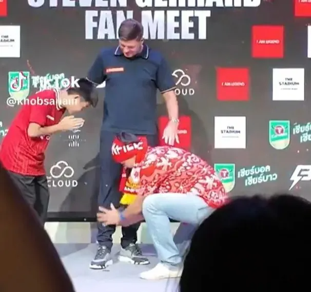 انتشر مقطع فيديو لأسطورة ليفربول ستيفن جيرارد (45 عاماً) على هامش رحلة في تايلاند يظهر فيه مشجع تايلاندي وهو يمسح ساقيه، وينقل يديه لساقي ابنه في العاصمة بانكوك.