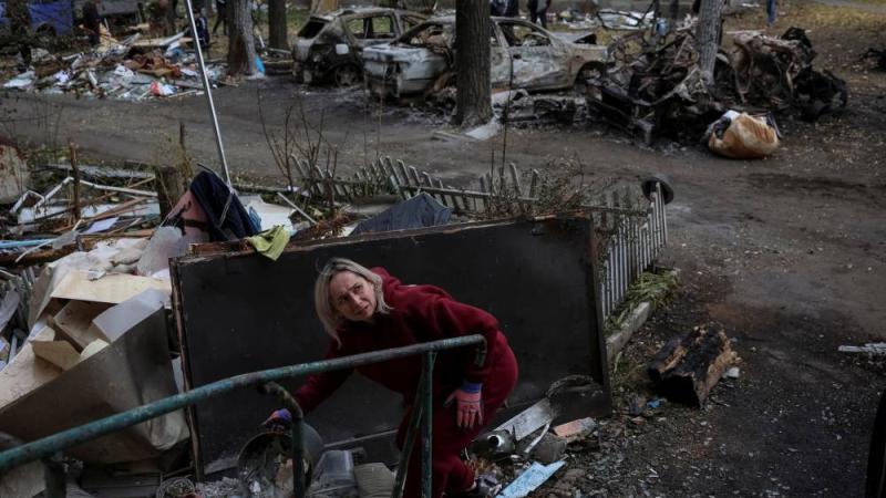 سيدة تزيل الزجاج المكسور بعد تعرض المبنى لغارة بمسيرة روسية في منطقة دنيبروبتروفسك