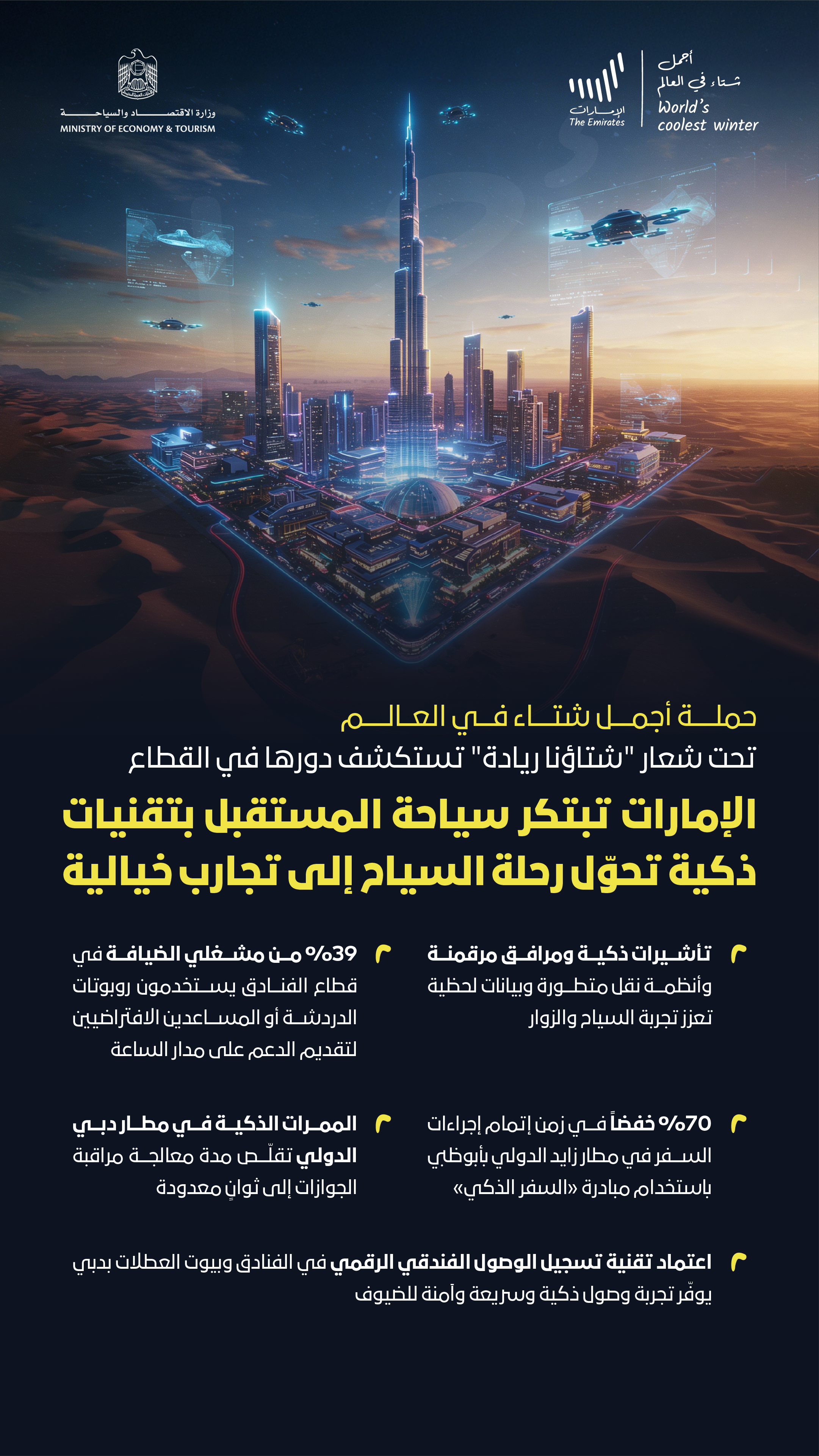 كما أسست دبي قاعدة قوية من خلال البنية التحتية الرقمية، وشبكات الجيل الخامس، والخدمات الحكومية اللاورقية، وهي مبادرات تدعم تبادل البيانات بشكل آمن، وتوفّر رؤى آنية لقطاع السياحة، وتُعزّز ممارسات المدن الذكية المستدامة، كما تم اعتماد تقنية تسجيل الوصول الفندقي الرقمي لتصبح إحدى القنوات الرئيسية المعتمدة في جميع فنادق دبي، وبيوت العطلات، بما يوفّر تجربة وصول ذكية وسريعة وآمنة للضيوف، المحليين والدوليين.