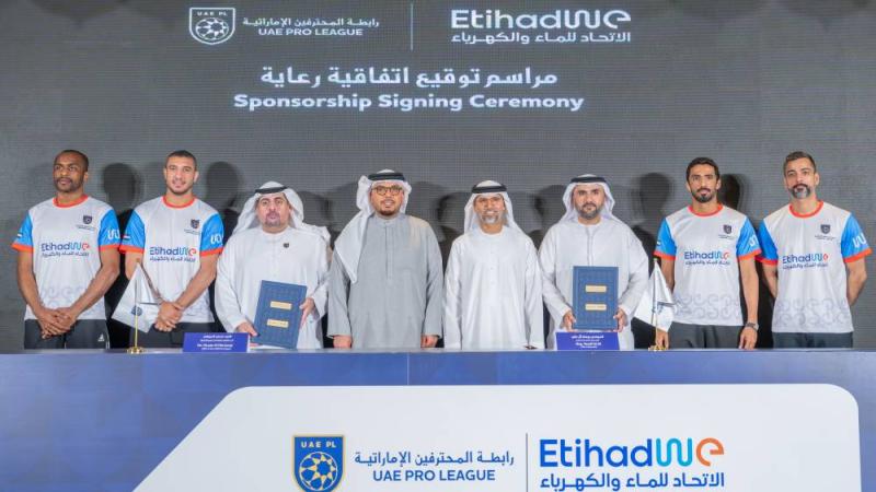 وتم توقيع الاتفاقية اليوم في فندق قصر الإمارات ماندارين أورينتال بحضور سهيل بن محمد المزروعي وزير الطاقة والبنية التحتية، رئيس مجلس إدارة شركة الاتحاد للماء والكهرباء، وعبدالله ناصر الجنيبي رئيس رابطة المحترفين الإماراتية النائب الأول لرئيس اتحاد الإمارات لكرة القدم، والمهندس يوسف أحمد آل علي، الرئيس التنفيذي للاتحاد للماء والكهرباء، ومصعب المرزوقي المدير التنفيذي لرابطة المحترفين، ومديري الإدارات في المؤسستين.