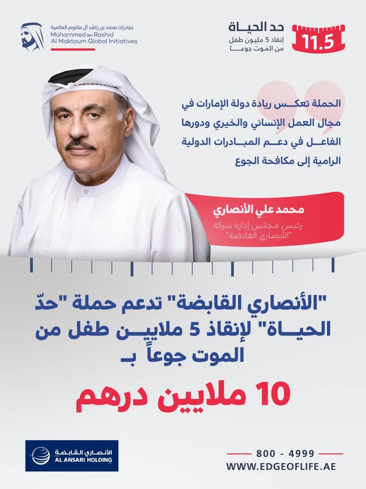 وأعرب محمد علي الأنصاري، رئيس مجلس إدارة شركة «الأنصاري القابضة»، عن الفخر بالمساهمة في حملة «حدّ الحياة» لإنقاذ 5 ملايين طفل من الموت جوعاً، التي أطلقها صاحب السموّ الشيخ محمد بن راشد آل مكتوم، نائب رئيس الدولة، رئيس مجلس الوزراء، حاكم دبي، رعاه الله، والتي تعكس ريادة دولة الإمارات في مجال العمل الإنساني والخيري، ودورها الفاعل في دعم المبادرات الدولية الرامية إلى مكافحة الجوع، وتحقيق أهداف التنمية المستدامة.